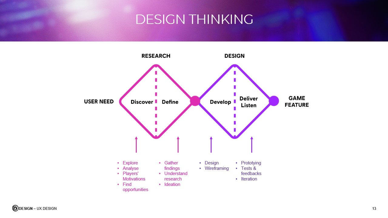 On this slide, I explain how to apply the design thinking process to video game development.